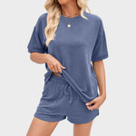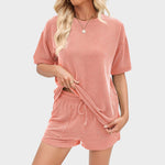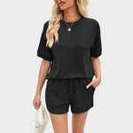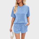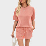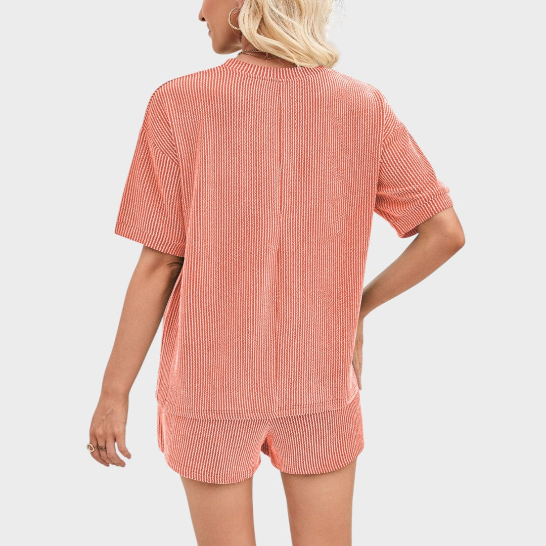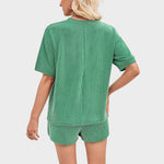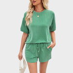 El conjunto Esmeralda presenta tonos vibrantes con textura acanalada, compuesto por una camiseta de manga corta y un pantalón corto con cordón ajustable. El tejido suave proporciona comodidad y ligereza, ideal para días calurosos o tiempo libre. El diseño contemporáneo y el corte casual realzan cualquier estilo, permitiendo combinaciones versátiles. Perfecto para quienes buscan un look casual con un toque moderno.