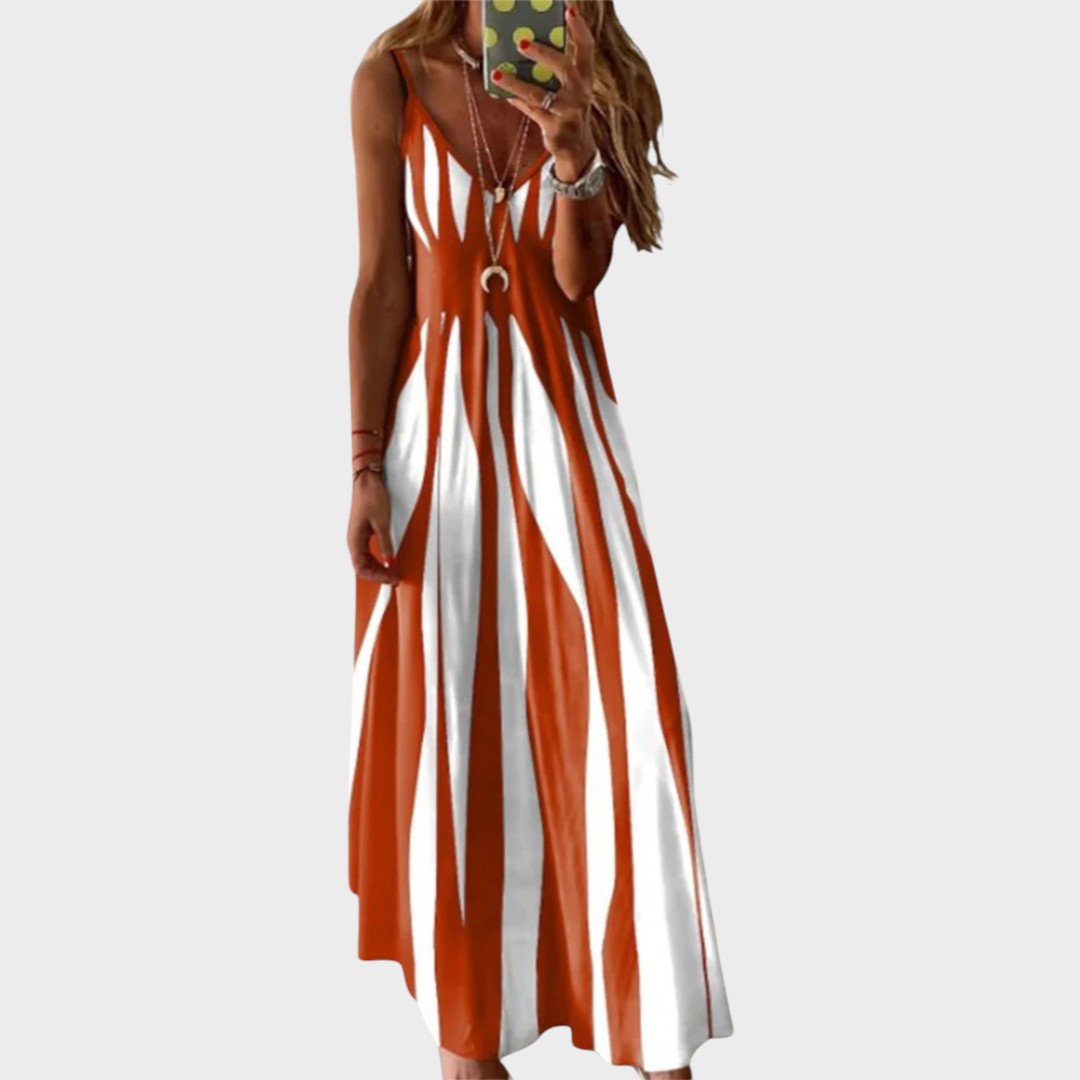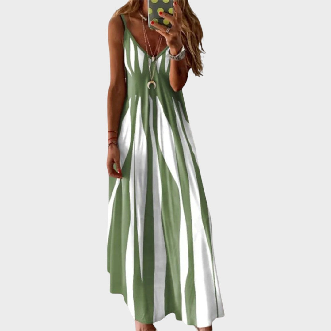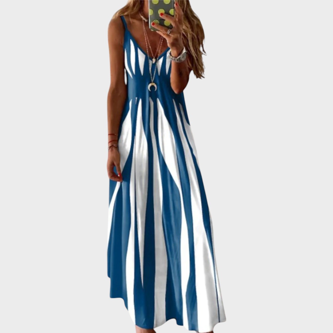 El vestido Anita combina la elegancia sencilla con la comodidad relajada. Las rayas verticales alargan la silueta, mientras que el corte sin mangas aporta una sensación fresca y ligera. Ideal para quienes buscan un estilo desenfadado, tanto para el día a día como para salir al atardecer.