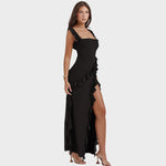 Amira es un vestido largo de tirantes finos, perfecto para el verano. Confeccionado en ligeras fibras de tergal, favorece el cuerpo con su corte entallado y cintura alta. Su diseño sencillo se realza con volantes que aportan un toque femenino y elegante.