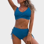 Este bikini combina estilo y seguridad a la perfección. Con una favorecedora braguita de cintura alta y un elegante top con detalle cruzado, irradiarás fuerza, sencillez y clase, ya sea que te relajes en la piscina o pasees por la playa.